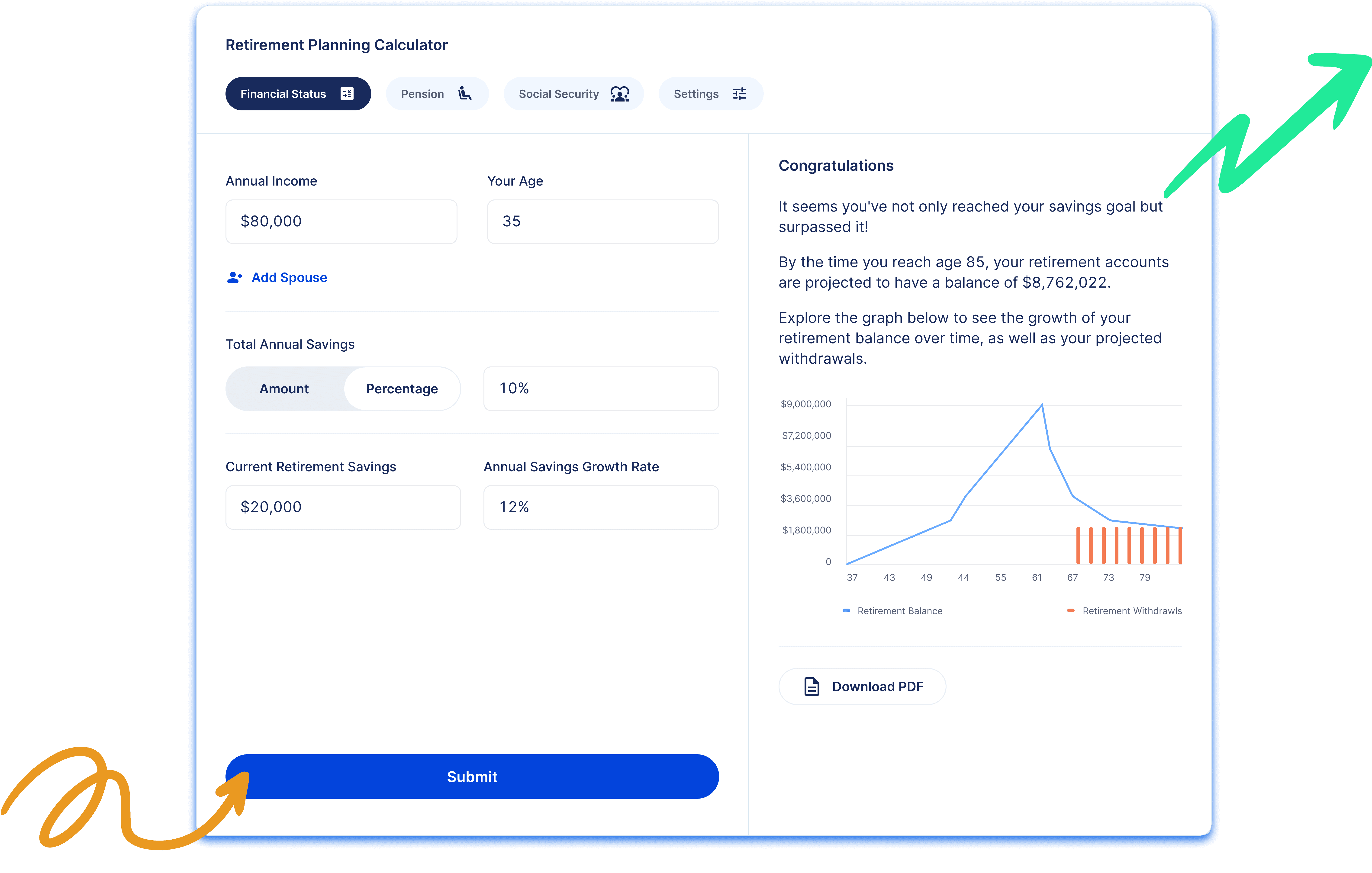 Worried about your retirement savings and if they are on track? Our retirement calculator provides clear, actionable insights, so you can confidently know where you’re at and adjust your plans as needed.