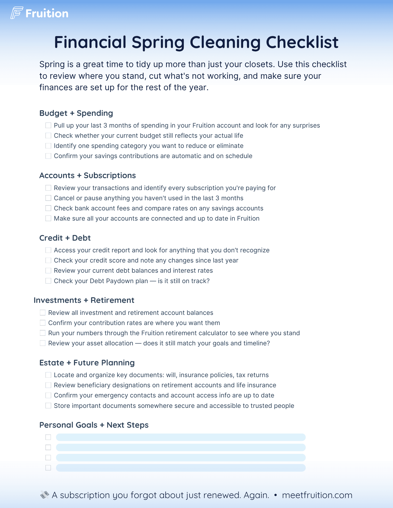 Spring cleaning isn't just for your home. Your finances deserve the same annual reset as your closets. This checklist walks you through a full financial review — spending, accounts, credit, investments, and estate basics — so you can cut what's not working and head into the rest of the year with clarity.