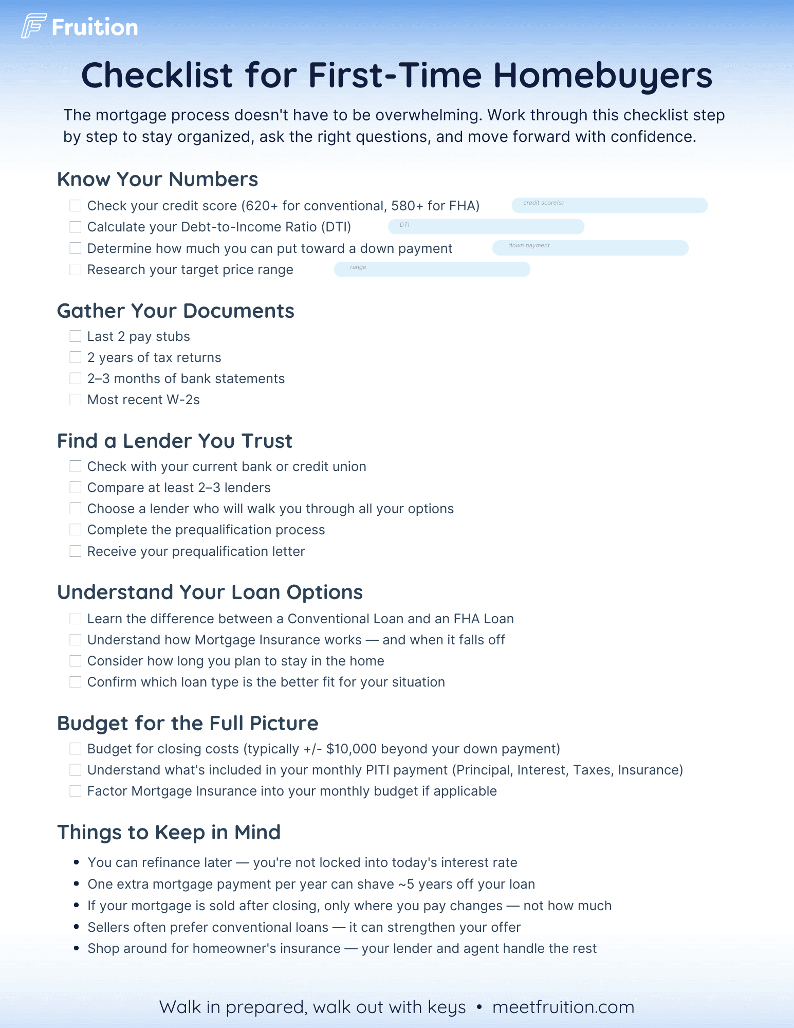 Buying your first home doesn't have to be overwhelming. This checklist breaks down the mortgage process into manageable steps—from knowing your numbers to understanding loan options—so you can stay organized, ask the right questions, and move forward with confidence.