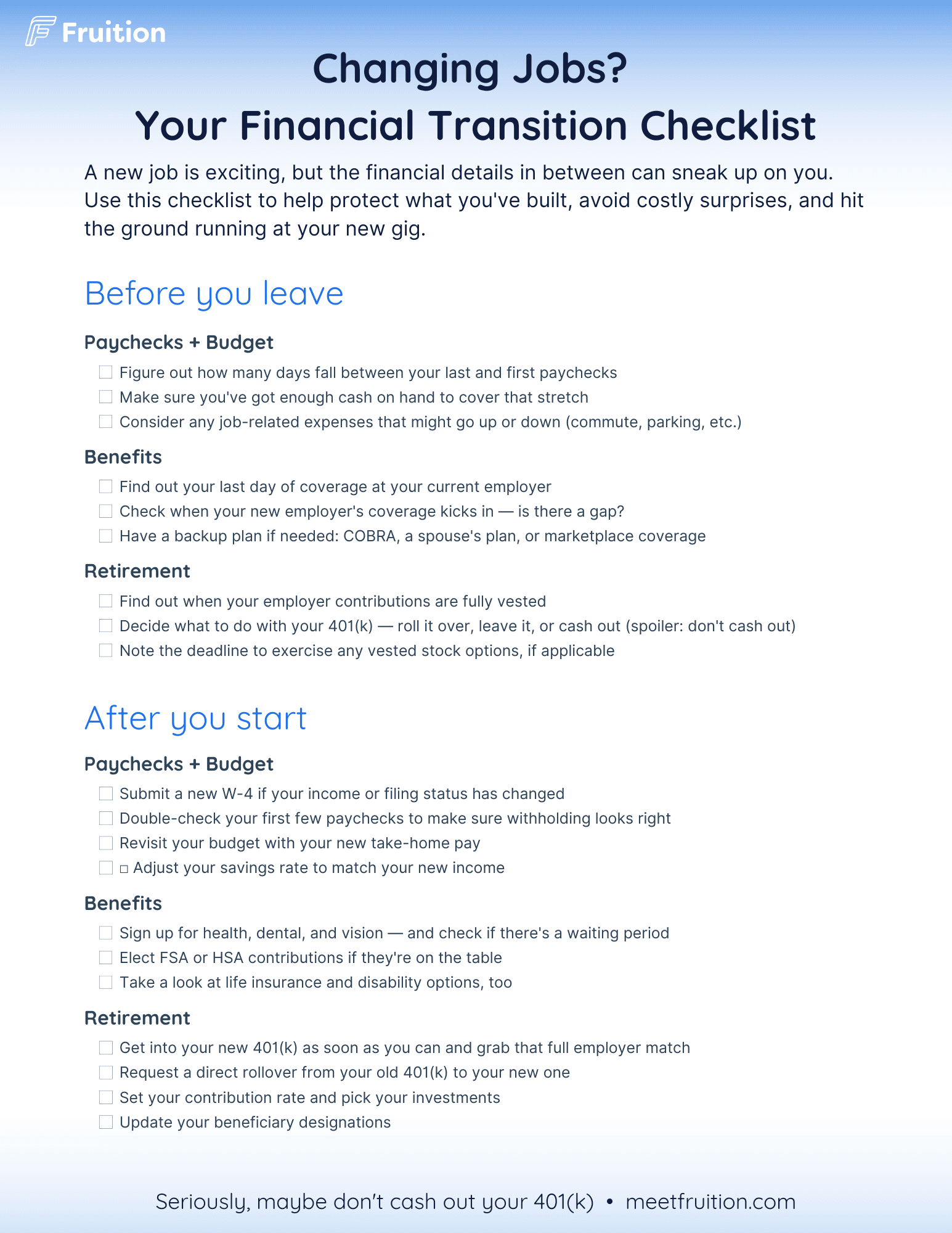 Know what to do before you leave and after you start. The checklist is organized into two clear phases so nothing gets missed on either end of your transition. From your last day of insurance coverage to your first paycheck at the new job, you'll know exactly what to watch for.