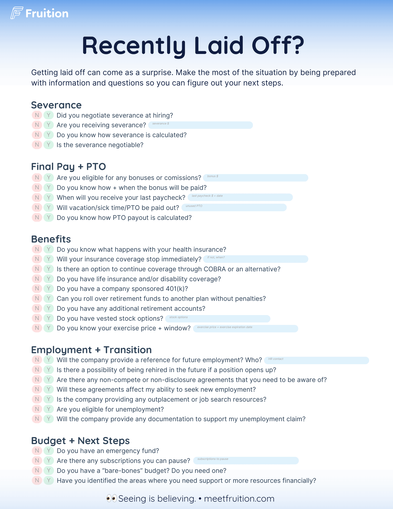 Your brain might freeze upon hearing the words "laid off" and there's lots of questions that need answers. Don't rely on your memory alone in times of high stress. This checklist will keep things in perspective, give you a way to organize the information being provided by your soon-to-be former employer, and help prepare you for the days to come. Don't leave money or options on the table.